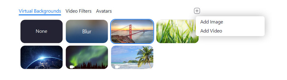 3. Select an image or video from one of Zoom’s default offerings, or add your own by clicking on the plus (+) sign, and your background will be changed during the Zoom call.