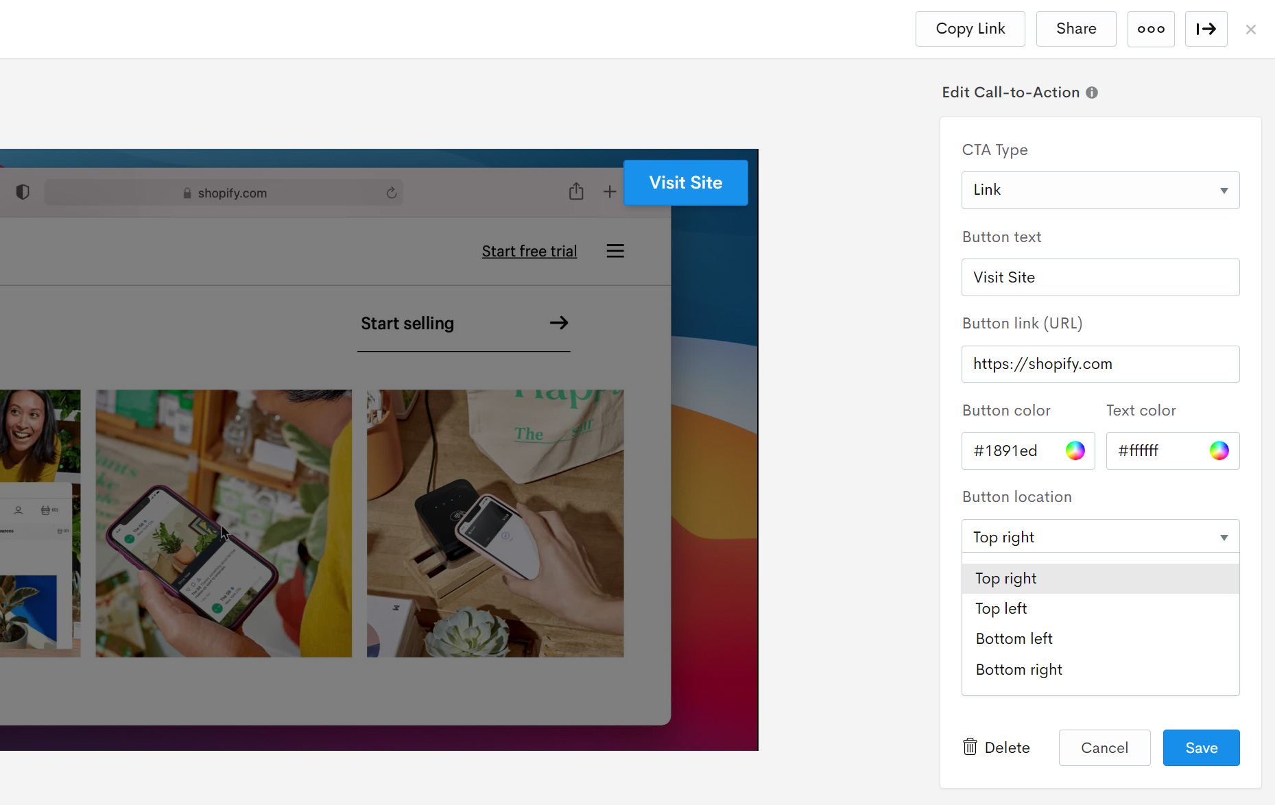 Call-to-action buttons can now be repositioned to any of the four corners of a video. We’ve added a new Button location dropdown to the CTA panel that lets you choose between four locations for the button: Top-right, Top-left, Bottom-left, and Bottom-right.
